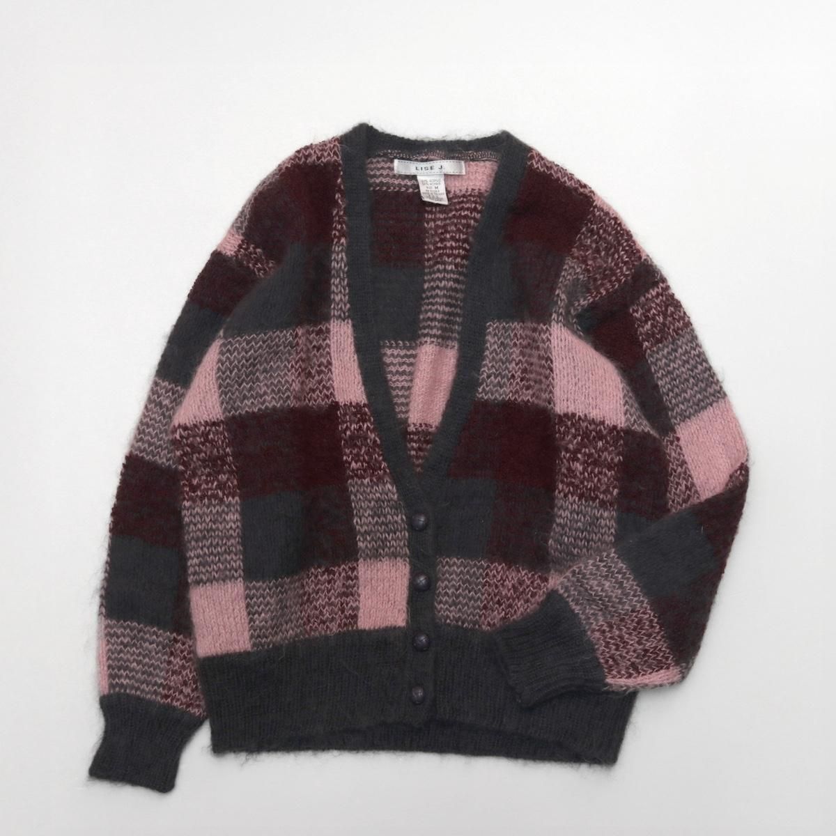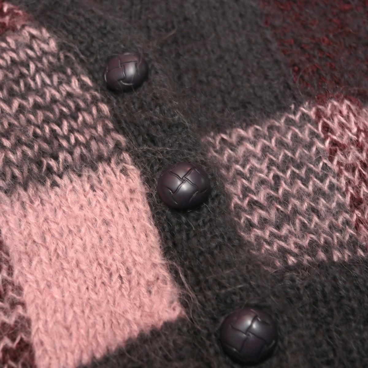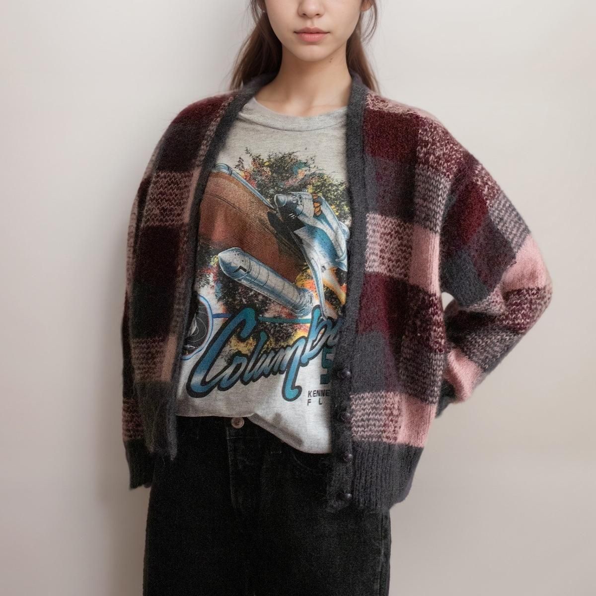 1990s ヴィンテージ モヘア混 チェック ニットカーディガン ピンクxグレー 9101-9